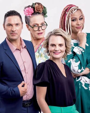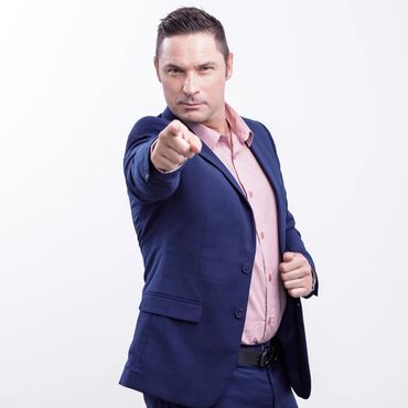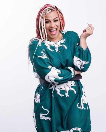 Blonde woman smiling confidently in a black sequined top with arms crossed.
