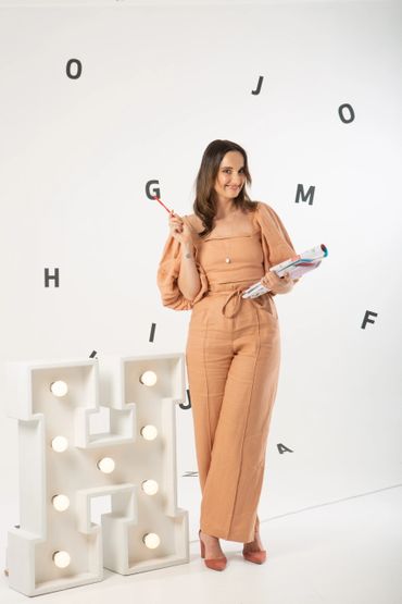 Smiling woman in yellow pants and black sheer polka dot blouse.
