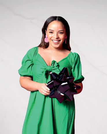 Smiling woman with long wavy hair wearing a green strapless top and jeans.